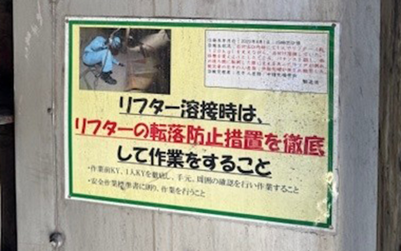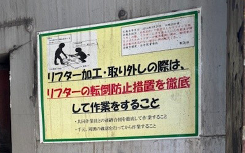 災害現場に災害情報を掲示することで、災害を風化させることなく教訓として伝承する活動を推進しています。「見える化」活動によりルール遵守の注意喚起と相互注意を促し、安全に対する意識向上につながっています。