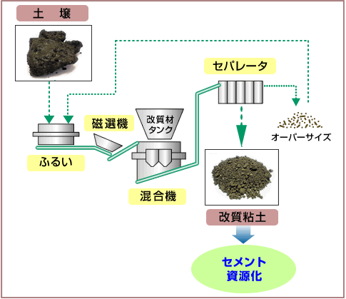 年間合計100万t規模のキャパシティを持つ物流拠点では、土壌をセメント原料として最適な性状になるように改質しています。 現場から搬出される土壌の多くは、シルト質である程度の水分を含んでおり、緻密な塊状となっています。また、粘性も高く、輸送の際にさらに大きな塊になったり、受入設備に付着してつまりの原因になる場合もあります。 さらに、工場設備に致命傷を与える異物が混入していることもあります。 これらを防ぐために、事前に異物除去、改質を行うことによって、スムーズな受入を実現しています。 |