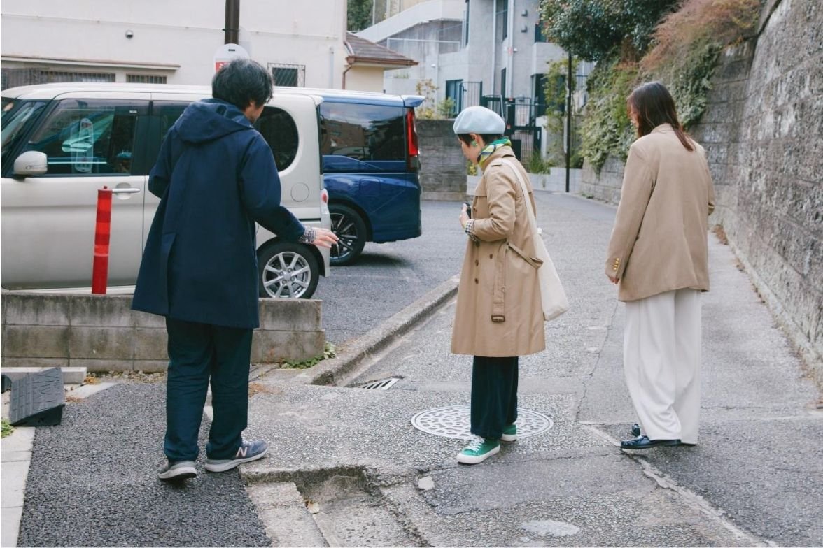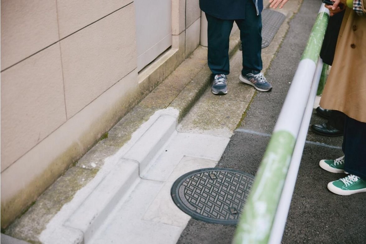 森田:自転車を止める柵を固定するためなんでしょうね。村田:なるほど!「動かさない」ためにセメントの力が使われているんですね。住宅街を抜けて大通りを進むと、一見何もない道で三土さんが足をとめました。三土:見てください。街歩きを続けるなかで、僕が感銘を受けたのが、この基準点です。