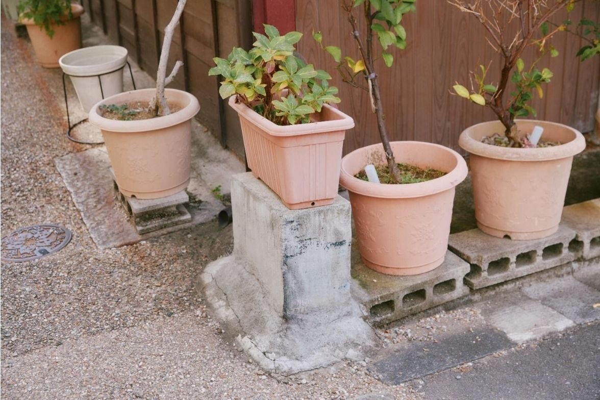 村田:暗渠沿いの道は緑深く、どことなくジメッとした雰囲気がしますね。おうちの前には鉢植えが並び、足もとにはコンクリートブロックが台として置かれています。三土:鉢の台にブロックを使うのは、本当にスタンダードですよね。村田:水はけや通気性、地面からの熱の影響を受けにくくするなど、いろんな理由がありそうですね。大事な鉢を目立たせる「お立ち台」としての役割もありそうです。三土:あ、車が家の角にぶつからないように置く「いけず石」ならぬ「いけずコンクリート」もあります。村田:川と道を分かつ舗装。地面と鉢植えを分かつブロック。私道と公道と分かつ、いけず石。コンクリートは、境界の役割も果たしているんですね。